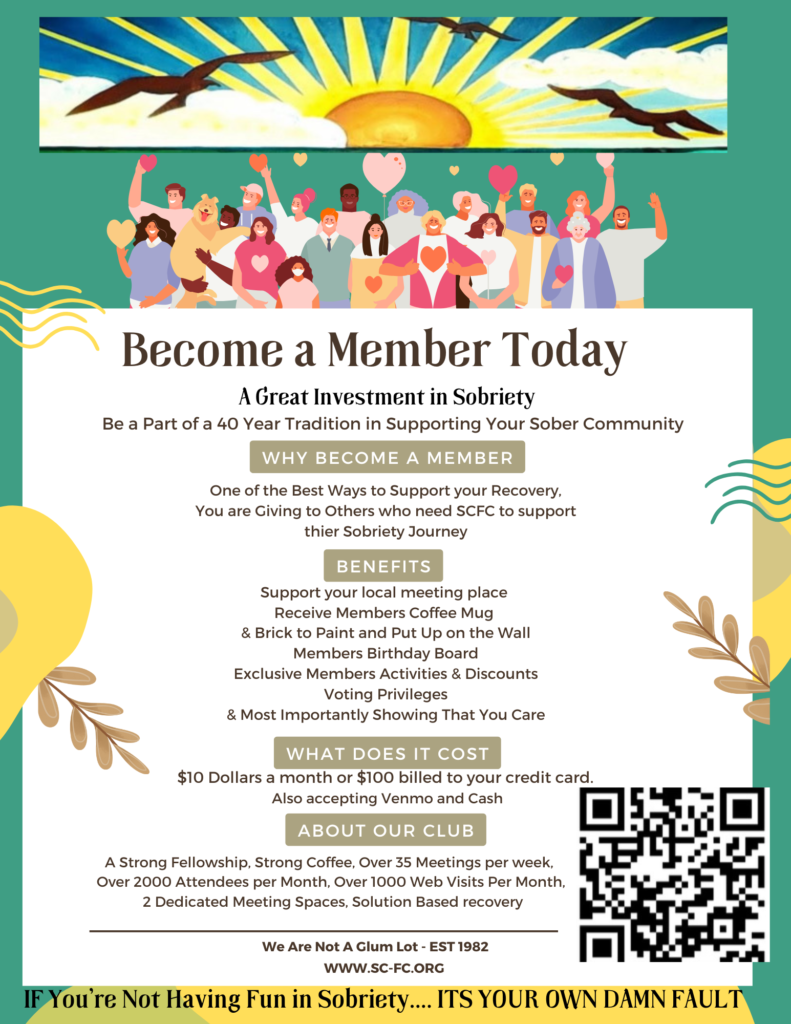 Becoming a member is one of the best and most affordable investments you can make in your recovery. Plus, you are gifting others who also need the Friendship Center to support their journey in sobriety. We are not a glum lot!